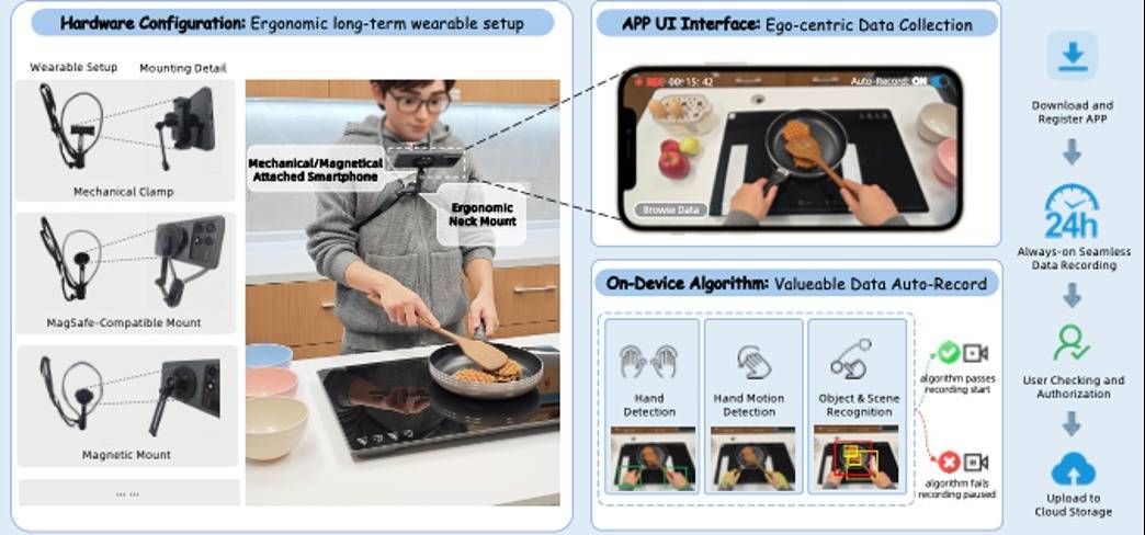 低成本采集只是起点。据论文介绍,蚂蚁数科攻克了“长视频转化为训练数据”的技术难题:该方案通过端侧轻量级视觉模型自动识别手物交互并触发录制,利用大语言 - 视觉模型将连续视频切分为带语义标签的原子动作片段,最终经云端自动标注、过滤与清洗,让手机录制的视频自动转化为高质量、标准化的训练数据。