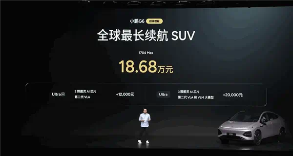 小鹏G6超级增程版3月6日正式上市,全系只推出一个基础版型1704 Max,售价18.68万元。Ultra SE配备2颗图灵AI芯片、第二代VLA系统大额配资,选装价格1.2万元;Ultra版本为3颗图灵AI芯片,支持第二代VLA和VLM大模型,选装价格2万元。