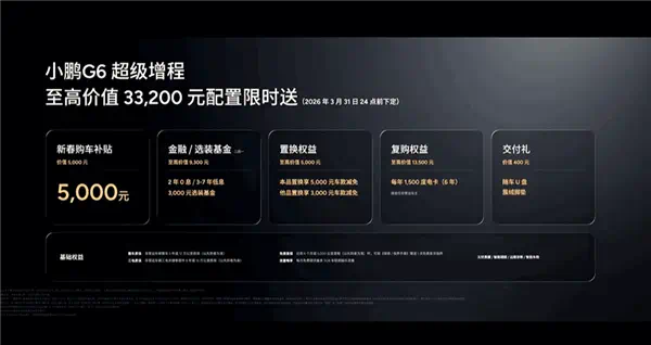 权益方面,在3月31日24点下订,限时赠送价值33200元配置。包括5千元新春购车补贴、至高千元置换补贴、金融/选装基金二选一、复购用户每年赠送1500度电卡(6年)等。