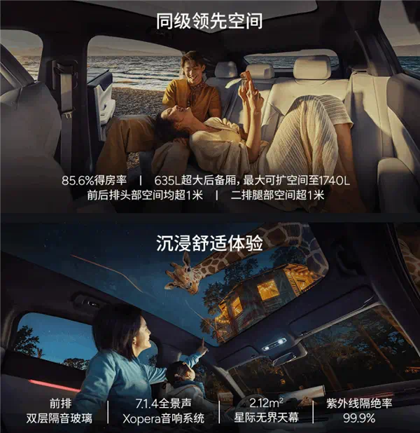 内饰采用全新环抱式样式设计,配备贯穿式的空调出风口,下方为无线充电面板,车内配备ENC+RNC主动降噪功能,让增程车具备纯电车一样的NVH。